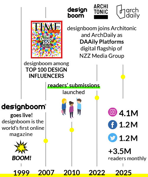 in the 25 years that we’ve been online, designboom has helped some of the world’s most respected companies to communicate their work and themselves to our audience in a purposeful manner, underlining the high profile of their activities. read more on advertising opportunities on designboom.